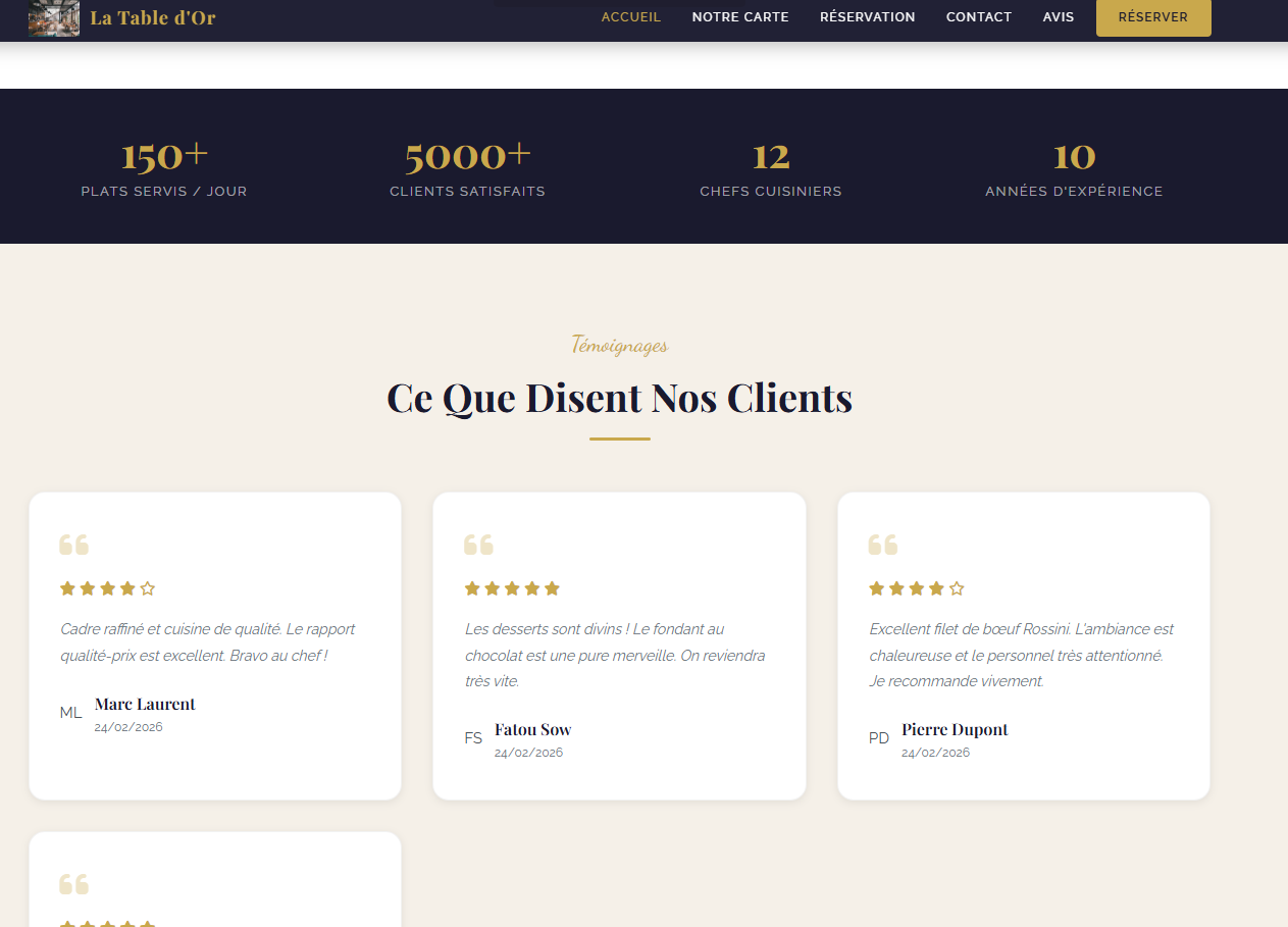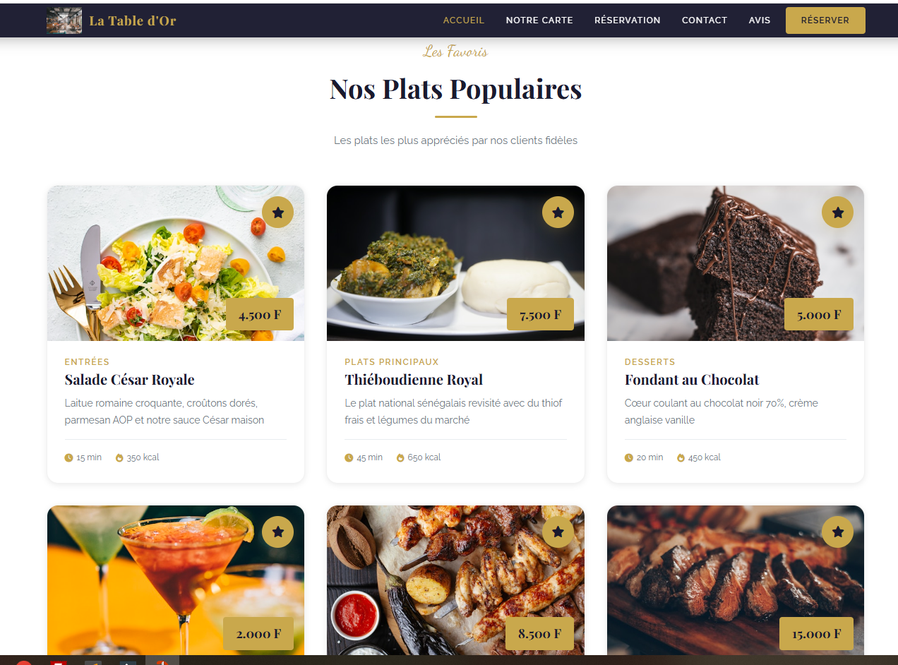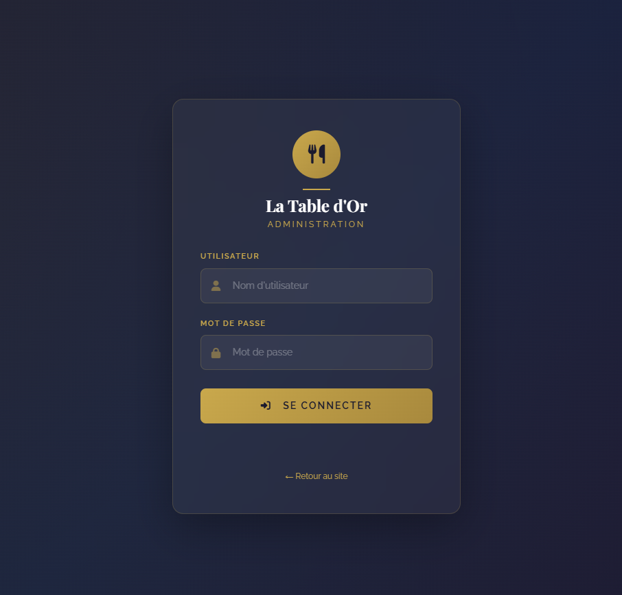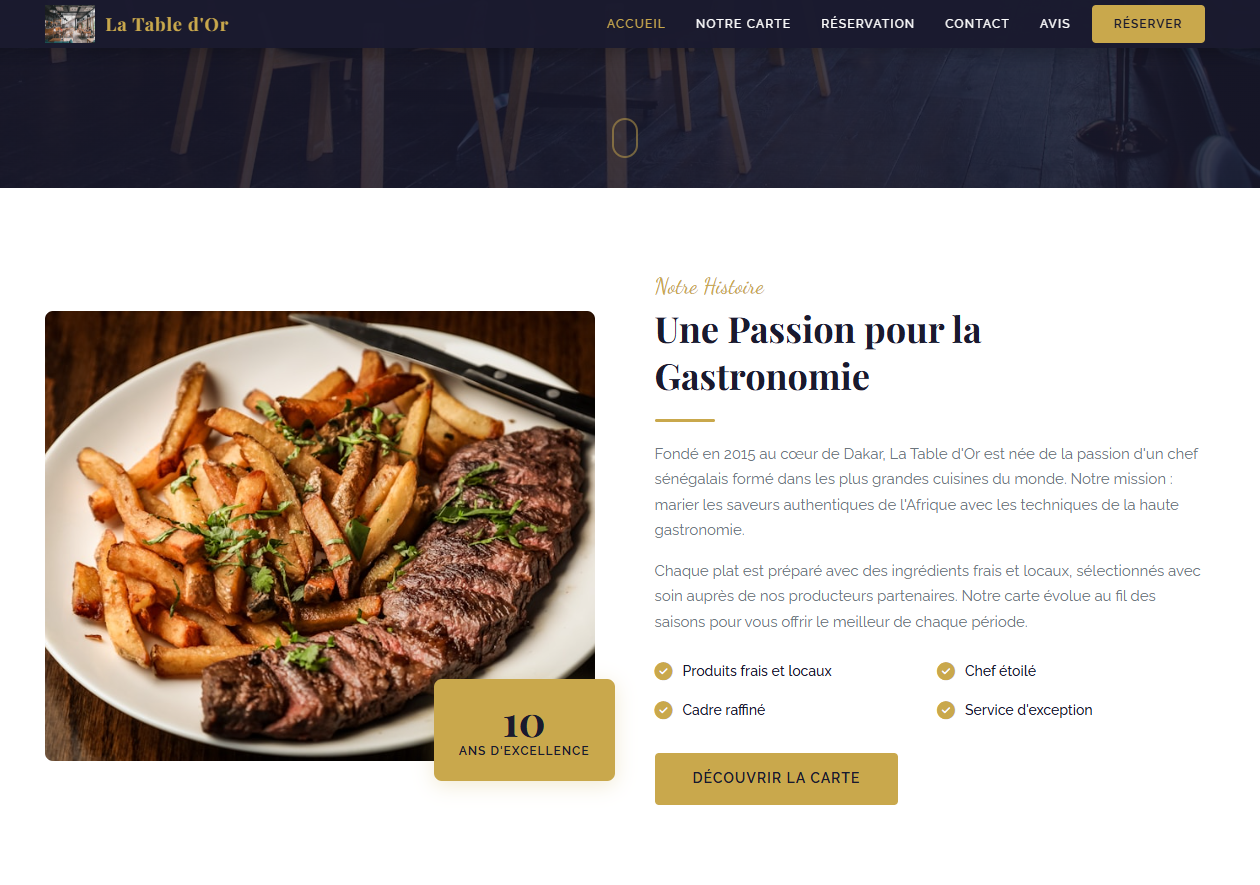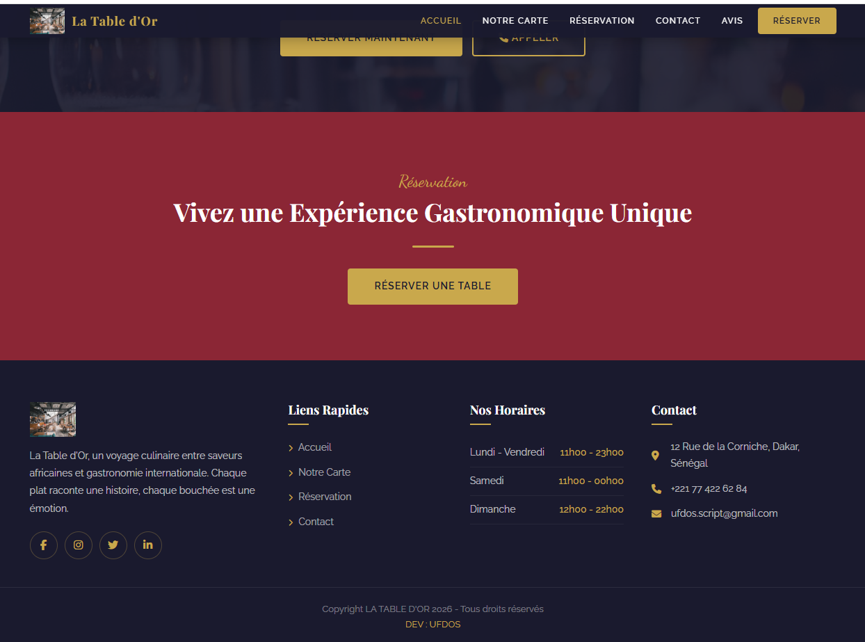 Template professionnel développé sur UFDOS CMS, design élégant noir & or, 100% responsive, avec administration complète intégrée. Idéal pour restaurants, brasseries, cafés et traiteurs haut de gamme.