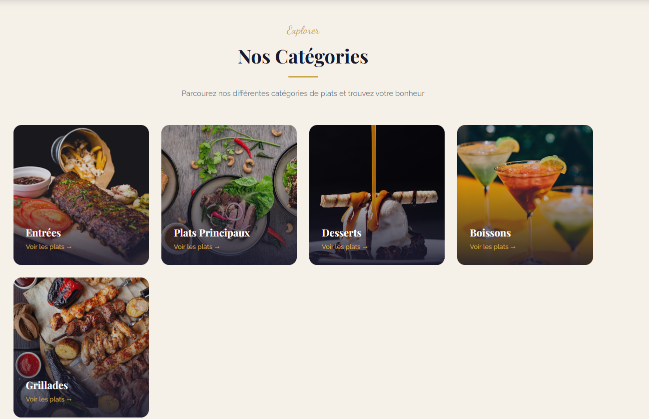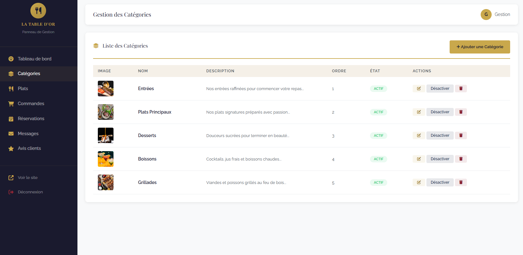 Admin : gestion complète des catégories, plats, commandes, réservations, messages et avis, avec tableau de bord en temps réel.